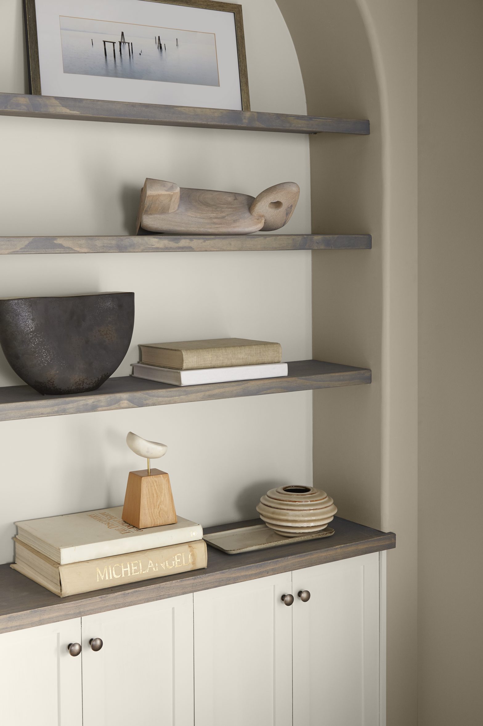 A beige room does not have to be boring, when layering different materials and décor elements that share a similar tone, interesting things start to happen resulting in simple yet beautiful focal point.
