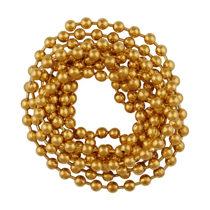 Brass plated ball chain used for pull cords on light fixtures and ceiling fans, keychains, as retaining chains for things such as counter pens, and dogtag chains.